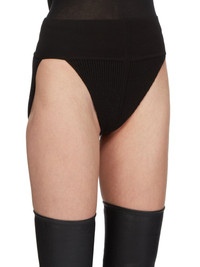 RICK OWENS FW23 LUXOR RUNWAY PANTIES IN BLACK HEAVY RIB RECYCLED CASHMERE THESE PANTIES ARE TIGHT FITTING AND HIGH WAISTED, THEY FEATURE THICK KNIT WAISTBAND ON A RIBBED HIGH CUT BRIEF, WITH A LINE RUNNING DOWN THE CENTRE FRONT AND CENTRE BACK HEAVY RIB RECYCLED CASHMERE - COLOR: BLACK - MATERIAL: 97% CASHMERE + 2% WOOL + 1% ELASTANE - DETAIL 68% VISCOSE + 32% POLYESTER - MODEL IS WEARING SIZE S - MODEL IS 181 CM TALL
