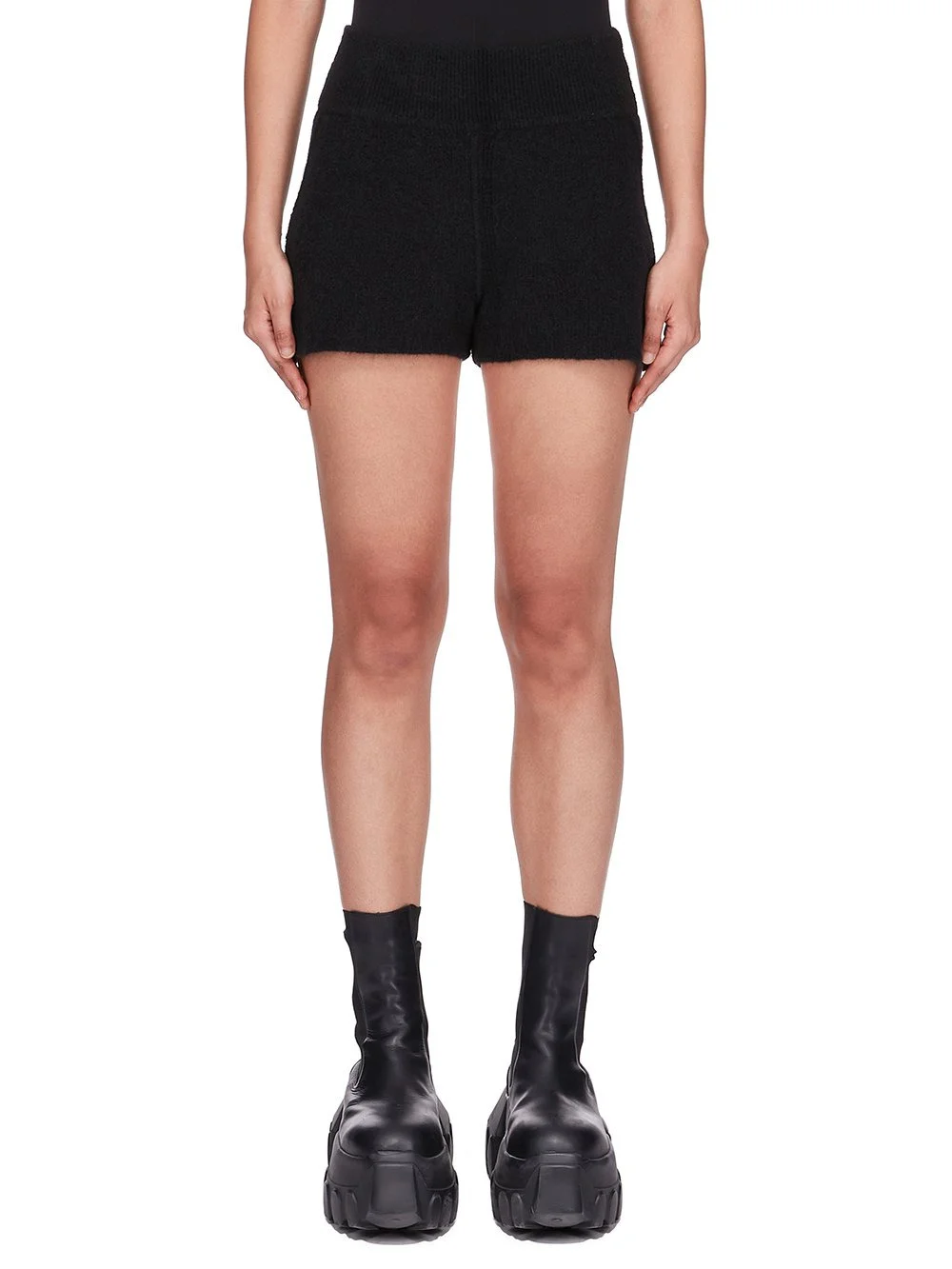 RICK OWENS FW25 CONCORDIANS SHORTS IN BLACK ALPACA KNIT THESE SHORTS ARE HIGH ON THE THIGH LENGTH. THEY HAVE A WIDE RIBBED WAISTBAND, AND BEVELED SIDE SLITS THIS A DENSE BUT LIGHT KNIT WITH A SOFT SLIGHTLY FLUFFY HAND COLOR: BLACK MATERIAL: 48% ALPACA + 30% NYLON + 20% WOOL + 2% ELASTANE MODEL IS 181CM TALL MODEL WEARS SIZE S