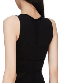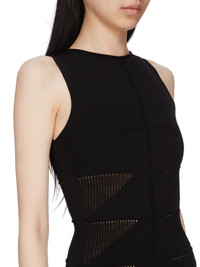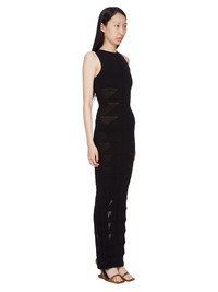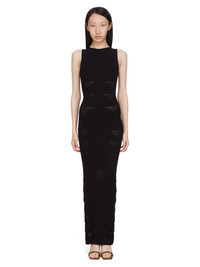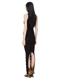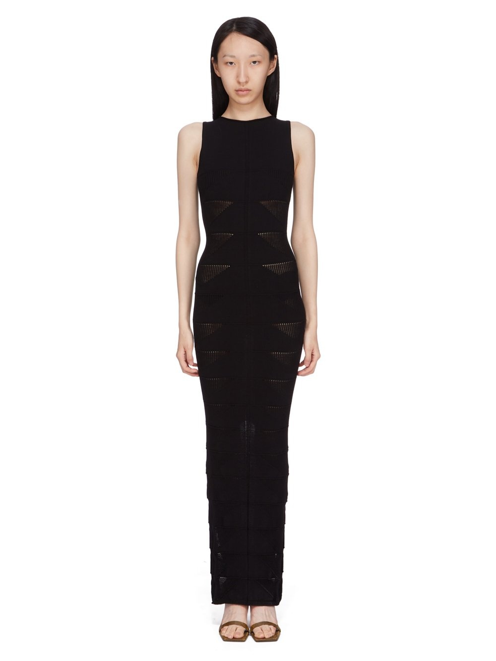 RICK OWENS SS25 HOLLYWOOD TANK DRESS MOTIVO IN BLACK RASATO MOTIVO KNIT THIS TANK DRESS MOTIVO IS ANKLE LENGTH. IT HAS A ROUND NECK WITH A NARROW ROLLED EDGE, AND TANK SHOULDERS. IT HAS KNIT PARALLEL LINES RUNNING HORIZONTALLY ACROSS THE TORSO AND SKIRT, FINISHING IN A SEMI-TRANSPARENT TRIANGULAR RIBBED MOTIVO AT THE SIDE BODY IT FEATURES A SLIM LINE RUNNING DOWN THE CENTER FRONT, AND SIGNATURE CHANNEL RUNNING DOWN THE CENTER BACK SPINE THIS MEDIUMWEIGHT VISCOSE RASATO KNIT IS KNITTED WITH A GRAPHIC MOTIF AND HAS A STRETCHY AND DRY HANDFEEL COLOR: BLACK MATERIAL: 68% VISCOSE + 32% POLYESTER MODEL IS 181CM TALL MODEL WEARS SIZE S