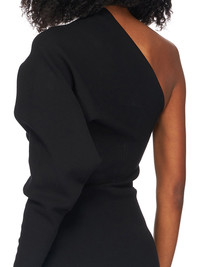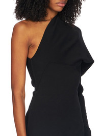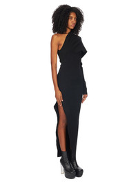 RICK OWENS SS24 LIDO ONE SHOULDER DRESS IN BLACK STRETCH VISCOSE KNIT THIS ONE SHOULDER DRESS IS ANKLE LENGTH WITH A CLOSE TO THE BODY FIT. IT IS SLEEVELESS WITH AN ASYMMETRICAL DRAPED NECKLINE AND ONE SHOULDER THAT CREATES A SLIGHTLY DRAPED RIGHT FRONT AND BACK. IT FEATURES A GEO MOTIVO RUNNING ACROSS THE CHEST AND DOWN THE SIDE BODY, AND A SPLIT IN THE LEFT SIDE TO JUST ABOVE THE KNEE THIS KNIT IS MADE WITH ECOVERO CERTIFIED VISCOSE WHICH ENSURES THAT THE FIBERS ARE PRODUCED FROM RESPONSIBLY MANAGED PLANTATIONS AND NO DEFORESTATION OCCURS - COLOR: BLACK - MATERIAL: 63% VISCOSE + 27% POLYESTER + 7% NYLON + 3% ELASTANE - MODEL IS 181CM TALL - MODEL WEARS SIZE S