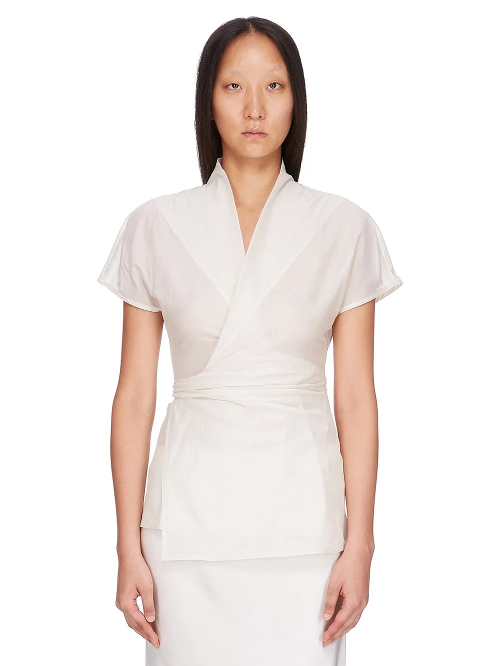 RICK OWENS SS25 HOLLYWOOD LAURA SL TOP IN DINGE COTTON VOILE THIS LAURA SL TOP IS HIP-LENGTH AND SLEEVELESS. IT HAS WIDE SHOULDERS WHICH FALL INTO VERY SMALL CAP SLEEVES, AND A BODY THAT WRAPS AROUND AND TIES WITH A BELT AT THE BACK, CREATING A V NECK WITH DRAPING DETAILS AND PLEATS AROUND THE WAIST THIS LIGHTWEIGHT AND SEMITRANSPARENT COTTON VOILE HAS A SOFT HANDFEEL THIS FABRIC IS MADE USING GOTS CERTIFIED ORGANIC COTTON WHICH MEANS THE NATURAL FIBER IS GROWN WITHOUT HARMFUL CHEMICALS, LEAVING OUR SOIL, AIR AND WATER CLEANER FROM CONTAMINATES COLOR: DINGE MATERIAL: 100% COTTON MODEL IS 181CM TALL MODEL WEARS SIZE 40