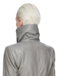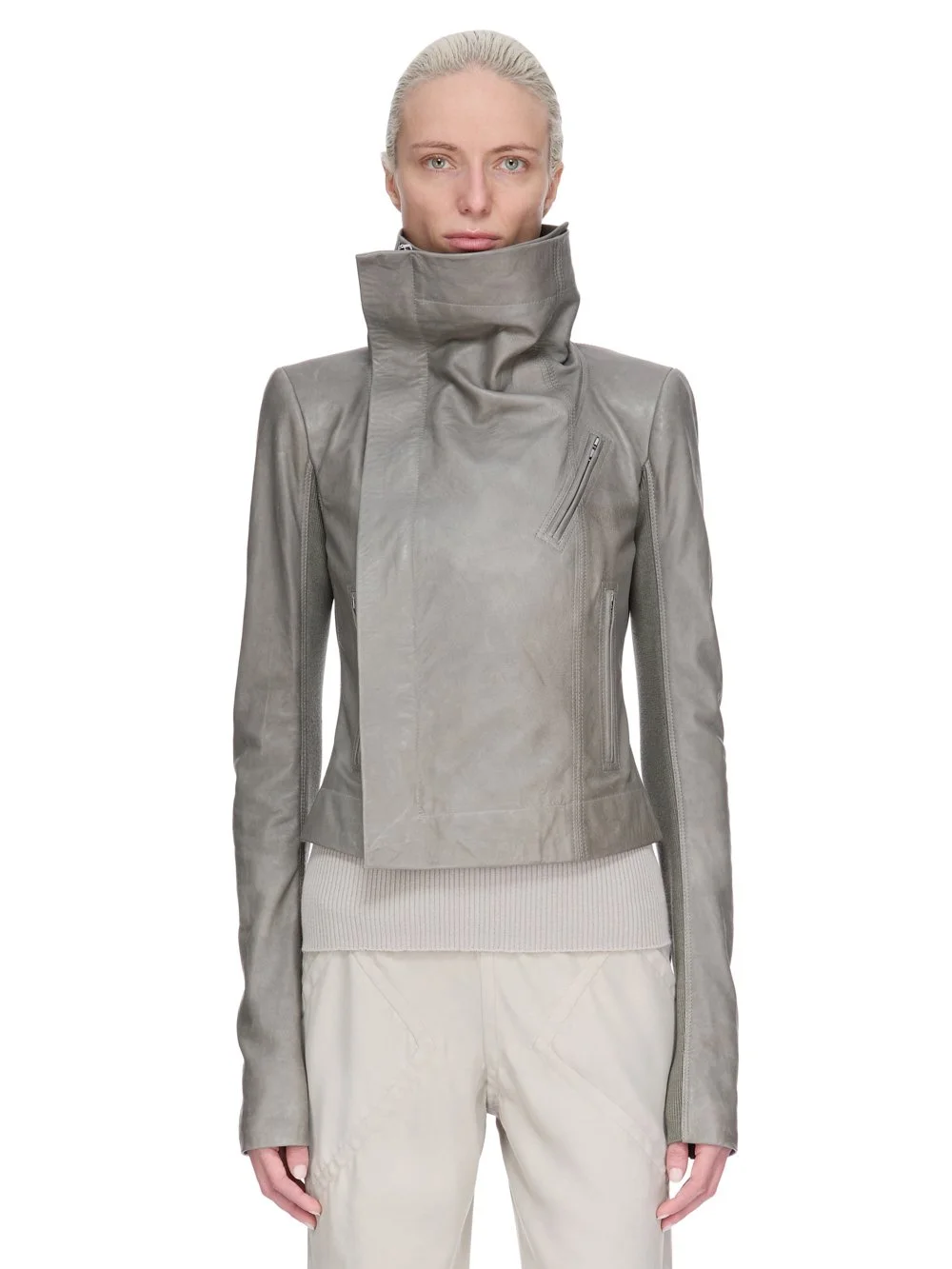 RICK OWENS FW25 CONCORDIANS CLASSIC BIKER IN WASHED INDIGO WAXY LAMB LEATHER THIS CLASSIC BIKER IS ABOVE HIP LENGTH, IT FEATURES A DOUBLE BREASTED FRONT WITH OFF CENTRE ZIPPER, WHICH CAN BE WORN OPEN AS A EASY DRAPE, HALF CLOSED AS A WIDE COLLAR OR FULLY ZIPPED UP TO CREATE A HIGH FUNNEL NECK. IT HAS THREE FRONT ZIPPED JET POCKETS WITH TOPSTITCHING AND RIBBED PANELS ON THE UNDERSIDE OF THE SLEEVESIT IS FULLY LINED WITH TWO INTERNAL ZIPPED POCKETS THIS LIGHTWEIGHT LAMB LEATHER IS FINISHED USING NATURAL WAXES AND ANILINE WHICH MAKES A SUPPLE HANDFEEL BECAUSE THIS SKIN IS NAKED, NOT FINISHED USING ANY PIGMENTS COVERING THE SKIN, NATURAL MARKINGS AND SHADINGS ARE VISIBLE WHICH MAKES EACH SKIN AND PRODUCT UNIQUE THIS TANNERY IS LWG AUDITED COLOR: WASHED INDIGO MATERIAL: 100% LAMB LEATHER KNIT RIB UNDER SLEEVES 100% NEW WOOL BODY AND POCKETS LINING 100% COTTON SLEEVES LINING 100% CUPRO BUTTONS 100% BUFFALO HORN MODEL IS 181CM TALL MODEL WEARS SIZE 40