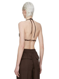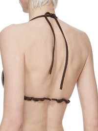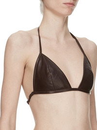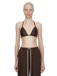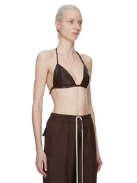 RICK OWENS SS25 HOLLYWOOD BRA IN MAHOGANY WAXY LAMB LEATHER THIS BRA IS A TRIANGLE SHAPE WITH A THIN STRAP THAT RUNS ACROSS THE BACK WITH A CLIP CLOSURE. IT ALSO TIES IN A HALTER STYLE BEHIND THE BACK NECK THIS LIGHTWEIGHT LAMB LEATHER IS FINISHED USING NATURAL WAXES AND ANILINE WHICH MAKES A SUPPLE HANDFEEL. BECAUSE THIS SKIN IS NAKED, NOT FINISHED USING ANY PIGMENTS COVERING THE SKIN, NATURAL MARKINGS AND SHADINGS ARE VISIBLE WHICH MAKES EACH SKIN AND PRODUCT UNIQUE. THIS TANNERY IS LWG AUDITED. COLOR: MAHOGANY MATERIAL: 100% LAMB LEATHER LINING 100% COTTON MODEL IS 181CM TALL MODEL WEARS SIZE 40