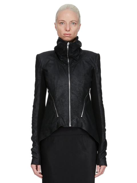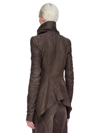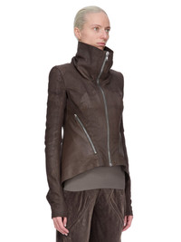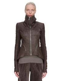 RICK OWENS FW25 CONCORDIANS ZIPFRONT NASKA BIKER IN DRKDUST BLISTER LAMB LEATHER THIS ZIPFRONT NASKA BIKER IS BELOW WAIST LENGTH. IT FEATURES A CENTRE FRONT ZIPPER, CREATING A HIGH FUNNEL NECK. IT HAS TWO FRONT SIDE BIAS ZIPPERED POCKETS, LONG SLIM SLEEVES WITH AN UNDERSIDE IN KNIT AND A CURVED NASKA HEMLINE THAT DIPS INTO TWO POINTS AT THE BACK. IT IS FULLY LINED AND HAS INTERNAL BUTTONED POCKETS THIS LIGHTWEIGHT LAMB LEATHER HAS AN EXAGGERATED UNEVEN BLISTERED TEXTURE AND A SOFT, FLUID HANDFEEL. THE BLISTERED TEXTURE IS ACHIEVED BY EXAGGERATING THE NATURAL GRAIN TEXTURE OF EACH SKIN, THEREFORE THE LOOK OF EACH SKIN IS UNIQUE. THIS LEATHER IS MADE BY A THIRD GENERATION FAMILY OWNED TANNERY IN THE SOUTH OF ITALY. COLOR: DRKDUST MATERIAL: 100% LAMB LEATHER MODEL IS 181CM TALL MODEL WEARS SIZE 40