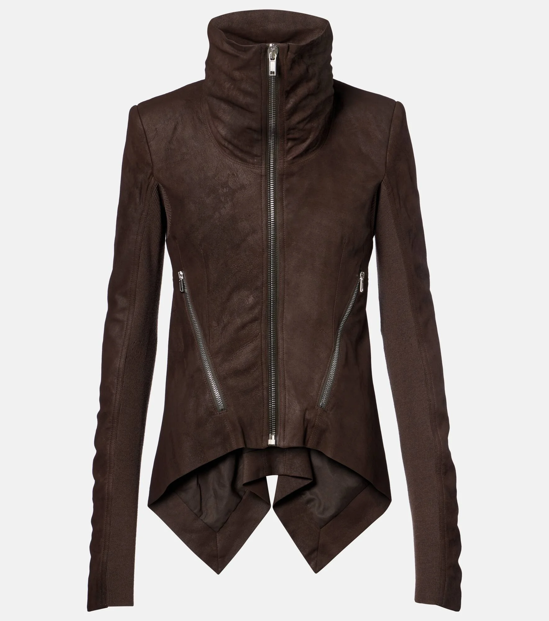 Aptly nicknamed The Lord of Darkness, Rick Owens brings gothic and industrial inspiration to avant-garde design. This sleek jacket is crafted from supple leather and features diagonal zipped pockets and a funnel neckline. Product Details - Material: 100% lamb leather - Care instructions: specialist clean - Made in Moldova - Designer color name: Drkdust - Item color: brown - Lining: 100% cotton - Sleeve lining: 100% cupro - Details: 100% horn - Trim: 100% virgin wool - Closure: zipped front - Pockets: internal pockets, zipped pockets - Item number: P01068226 Size & Fit - True to size - Cinched waist - Partly stretchy fabric - Falls to the hip - The model seen in the picture is 178cm-5'10" and wearing a size IT 40