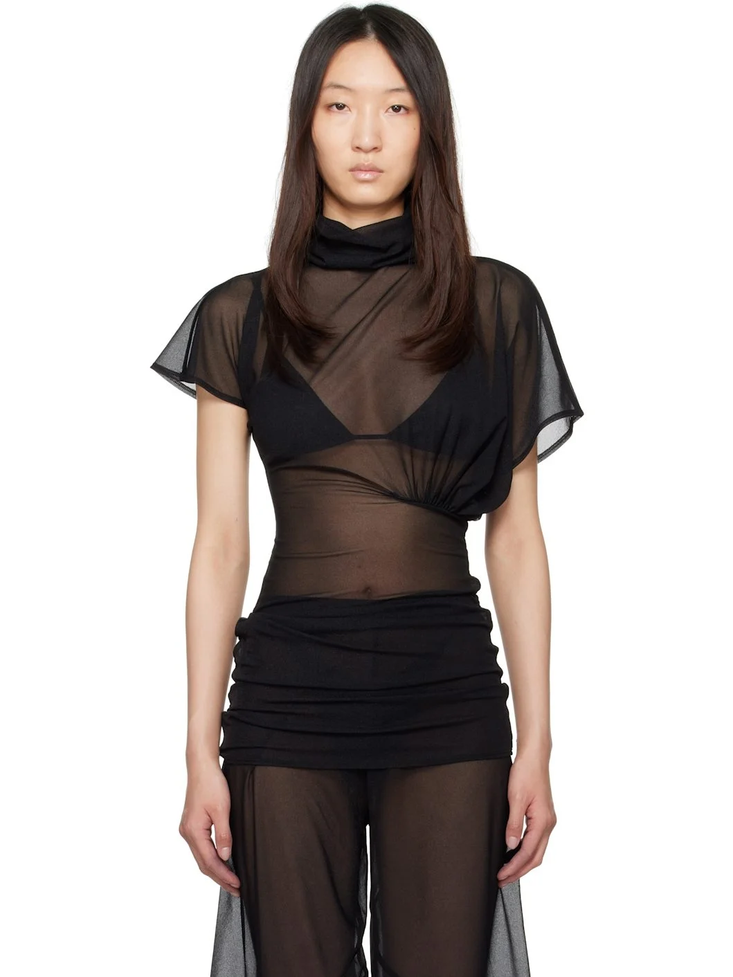 Sheer recycled polyester organza top. · GRS-certified recycled polyester · Asymmetrical construction · Cowl neck · Ruching at waist · Twisted detailing at hem · Raw edge at hem and cuffs Supplier color: Black 100% polyester. Made in Italy 251039F110023
