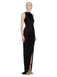 RICK OWENS FW25 CONCORDIANS SVITA GOWN IN BLACK SATIN VISCOSE JERSEY THIS SVITA GOWN IS FLOOR LENGTH AND SLEEVELESS. IT FEATURES A DRAPED NECKLINE THAT GATHERS ACROSS THE CHEST INTO THE RIGHT ARMHOLE AND HAS A BODY HUGGING FIT THAT GATHERS ACROSS THE BODY AND RUCHES INTO THE LEFT SIDE SEAM. IT THEN OPENS INTO A SPLIT FROM HIGH ON THE THIGH AND TAPERS SLIGHTLY TO THE HEM. THIS MEDIUMWEIGHT AND FLUID VISCOSE JERSEY HAS A GLOSSY SURFACE AND A COLD AND SOFT HANDFEEL. THIS JERSEY IS MADE FROM CERTIFIED VISCOSE WHICH ENSURES THAT THE FIBERS ARE PRODUCED FROM RESPONSIBLY MANAGED SOURCES AND NO DEFORESTATION OCCURS COLOR: BLACK MATERIAL: 100% VISCOSE MODEL IS 181CM TALL MODEL WEARS SIZE 40