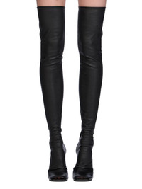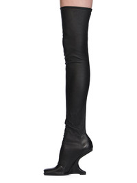 RICK OWENS FW25 CONCORDIANS CANTILEVER 11 BOOT IN BLACK STRETCH LAMB LEATHER THIS CANTILEVER 11 BOOT IS A HIGH CANTILEVERED HEEL BOOT WITH A TIGHT STRETCH, THIGH HIGH SOCK AND A SQUARE, SLIGHTLY OPEN TOE THIS STRETCH LAMB LEATHER HAS A SMALL GRAIN TEXTURE AND MATTE FINISH THIS LEATHER IS MADE BY A SECOND GENERATION FAMILY OWNED TANNERY IN THE SOUTH OF FRANCE SPECIALIZING ONLY IN STRETCH LEATHER PRODUCTION. EACH SKIN IS STRETCHED OUT TO ITS LIMIT AND BONDED TO A COTTON AND LYCRA FABRIC BACKING. WHEN DYED, THE HEAT OF THE PROCESS ACTIVATES THE LYCRA ELASTIC FIBRES THAT SHRINK THE FABRIC AND WITH IT THE SKIN, BACK TO ITS ORIGINAL SIZE. THE LEATHER THEN EXITS THE PROCESS AS STRETCH COLOR: BLACK MATERIAL: UPPER 65% LAMB LEATHER + 34% COTTON + 1% SPANDEX LINING 100% GOAT LEATHER INSOLE 100% CALF LEATHER HEEL HEIGHT 11CM