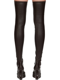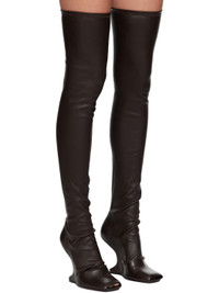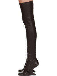 Knee-high stretch grained lambskin boots. · Square peep toe · Elasticized collar · Covered modified wedge heel with rubber injection · Leather sole with rubber injection · Heel: H4.75" Supplier color: Mahogany Upper: lambskin. Sole: leather, rubber. Made in Italy 252039F115000