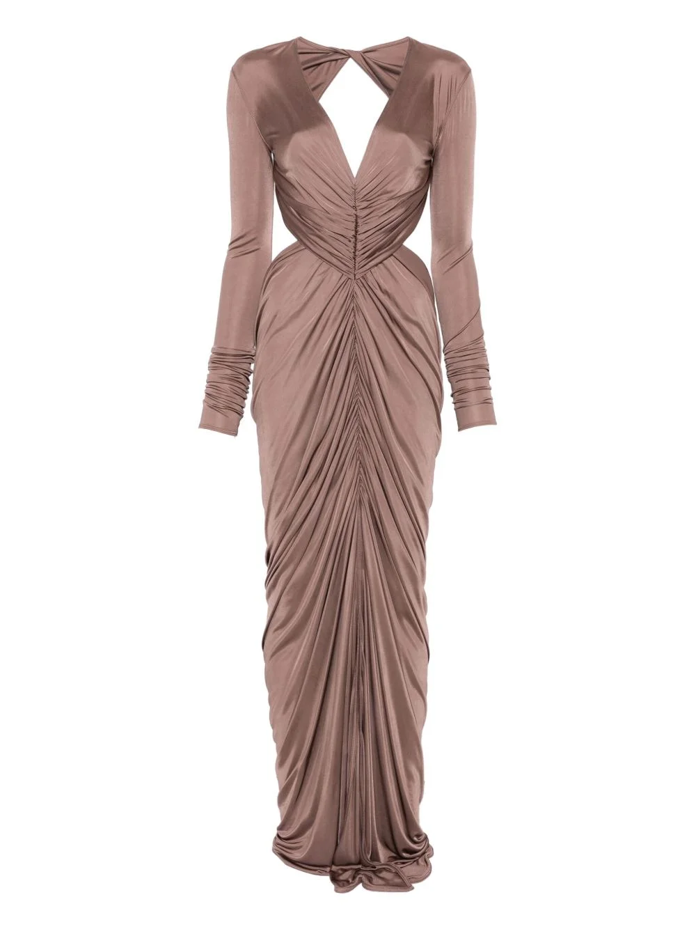 cut-out draped dress Highlights - Rose pink - Draped fabric - Cut-out detailing - Long sleeves - V-neck - Gathered waist Made in France Composition Viscose 100% Washing instructions Read Manufacturer Guidelines
