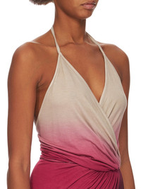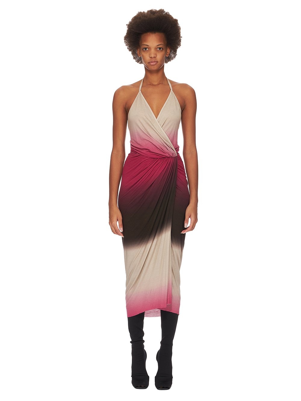 RICK OWENS SS23 EDFU VERED HALTER DRESS IN DEGRADE PRINTED FLUID VISCOSE JERSEY THIS VERED HALTER DRESS IS MID CALF LENGTH. IT HAS A DEEP V HALTER NECK WITH THIN STRAPS, AND A SCOOP OPEN BACK. IT WRAPS AROUND THE BODY, SECURING WITH TIES AND FEATURING DRAPING AROUND THE BODY, GATHERING INTO THE FRONT WAIST THIS FLUID MEDIUMWEIGHT VISCOSE JERSEY HAS A SOFT HANDFEEL AND IS PRINTED WITH A MULTI-COLORED DEGRADE MOTIF. IT IS MADE FROM CERTIFIED VISCOSE WHICH ENSURES THAT THE FIBERS ARE PRODUCED FROM RESPONSIBLY MANAGED SOURCES AND NO DEFORESTATION OCCURS - COLOR: MAGENTA DEGRADE - MATERIAL: 100% VISCOSE - MODEL IS WEARING SIZE 40 - MODEL IS 181 CM TALL