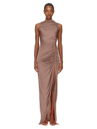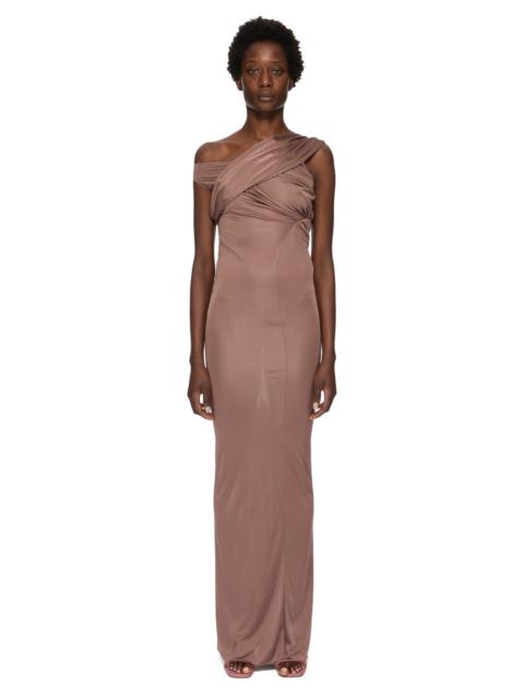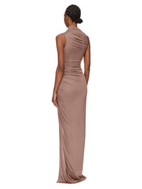 RICK OWENS FW25 CONCORDIANS SVITA GOWN IN MAUVE SATIN VISCOSE JERSEY THIS SVITA GOWN IS FLOOR LENGTH AND SLEEVELESS. IT FEATURES A DRAPED NECKLINE THAT GATHERS ACROSS THE CHEST INTO THE RIGHT ARMHOLE AND HAS A BODY HUGGING FIT THAT GATHERS ACROSS THE BODY AND RUCHES INTO THE LEFT SIDE SEAM. IT THEN OPENS INTO A SPLIT FROM HIGH ON THE THIGH AND TAPERS SLIGHTLY TO THE HEM THIS MEDIUMWEIGHT AND FLUID VISCOSE JERSEY HAS A GLOSSY SURFACE AND A COLD AND SOFT HANDFEEL THIS JERSEY IS MADE FROM CERTIFIED VISCOSE WHICH ENSURES THAT THE FIBERS ARE PRODUCED FROM RESPONSIBLY MANAGED SOURCES AND NO DEFORESTATION OCCURS COLOR: MAUVE MATERIAL: 100% VISCOSE MODEL IS 181CM TALL MODEL WEARS SIZE 40