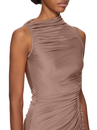RICK OWENS FW25 CONCORDIANS SVITA GOWN IN MAUVE SATIN VISCOSE JERSEY THIS SVITA GOWN IS FLOOR LENGTH AND SLEEVELESS. IT FEATURES A DRAPED NECKLINE THAT GATHERS ACROSS THE CHEST INTO THE RIGHT ARMHOLE AND HAS A BODY HUGGING FIT THAT GATHERS ACROSS THE BODY AND RUCHES INTO THE LEFT SIDE SEAM. IT THEN OPENS INTO A SPLIT FROM HIGH ON THE THIGH AND TAPERS SLIGHTLY TO THE HEM. THIS MEDIUMWEIGHT AND FLUID VISCOSE JERSEY HAS A GLOSSY SURFACE AND A COLD AND SOFT HANDFEEL. THIS JERSEY IS MADE FROM CERTIFIED VISCOSE WHICH ENSURES THAT THE FIBERS ARE PRODUCED FROM RESPONSIBLY MANAGED SOURCES AND NO DEFORESTATION OCCURS. COLOR: MAUVE MATERIAL: 100% VISCOSE MODEL IS 181CM TALL MODEL WEARS SIZE 40