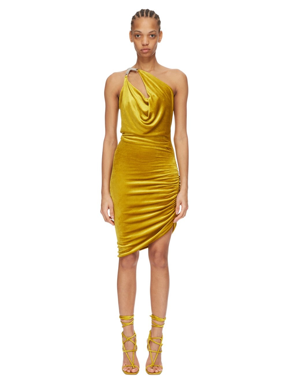 RICK OWENS FW24 PORTERVILLE HYDRA AALIYAH MINI IN ACID VELVET JERSEY THIS HYDRA AALIYAH MINI IS MID-THIGH LENGTH. IT HAS AN ASYMMETRICAL TOP, DRAPING ACROSS THE BODY TO THE RIGHT SHOULDER, WITH AN OPENING, EXPOSING THE CHEST. IT FEATURES A SILVER, 3 PRONG HYDRA HOOK CLIP, MADE FROM ZINC AND NICKEL FREE PALLADIUM ON THE RIGHT SHOULDER. IT DRAPES ACROSS THE BODY, GATHERING INTO THE LEFT HIP AND FINISHES IN A TIGHT FITTING SKIRT THIS MEDIUMWEIGHT VELVET JERSEY IS FLUID AND HAS A SOFT VELVETY HANDFEEL. THIS JERSEY IS MADE FROM FSC® CERTIFIED VISCOSE WHICH ENSURES THAT THE FIBERS ARE PRODUCED FROM RESPONSIBLY MANAGED SOURCES AND NO DEFORESTATION OCCURS - COLOR: ACID - MATERIAL: 83% VISCOSE + 17% NYLON - MODEL IS 181CM TALL - MODEL WEARS SIZE 40