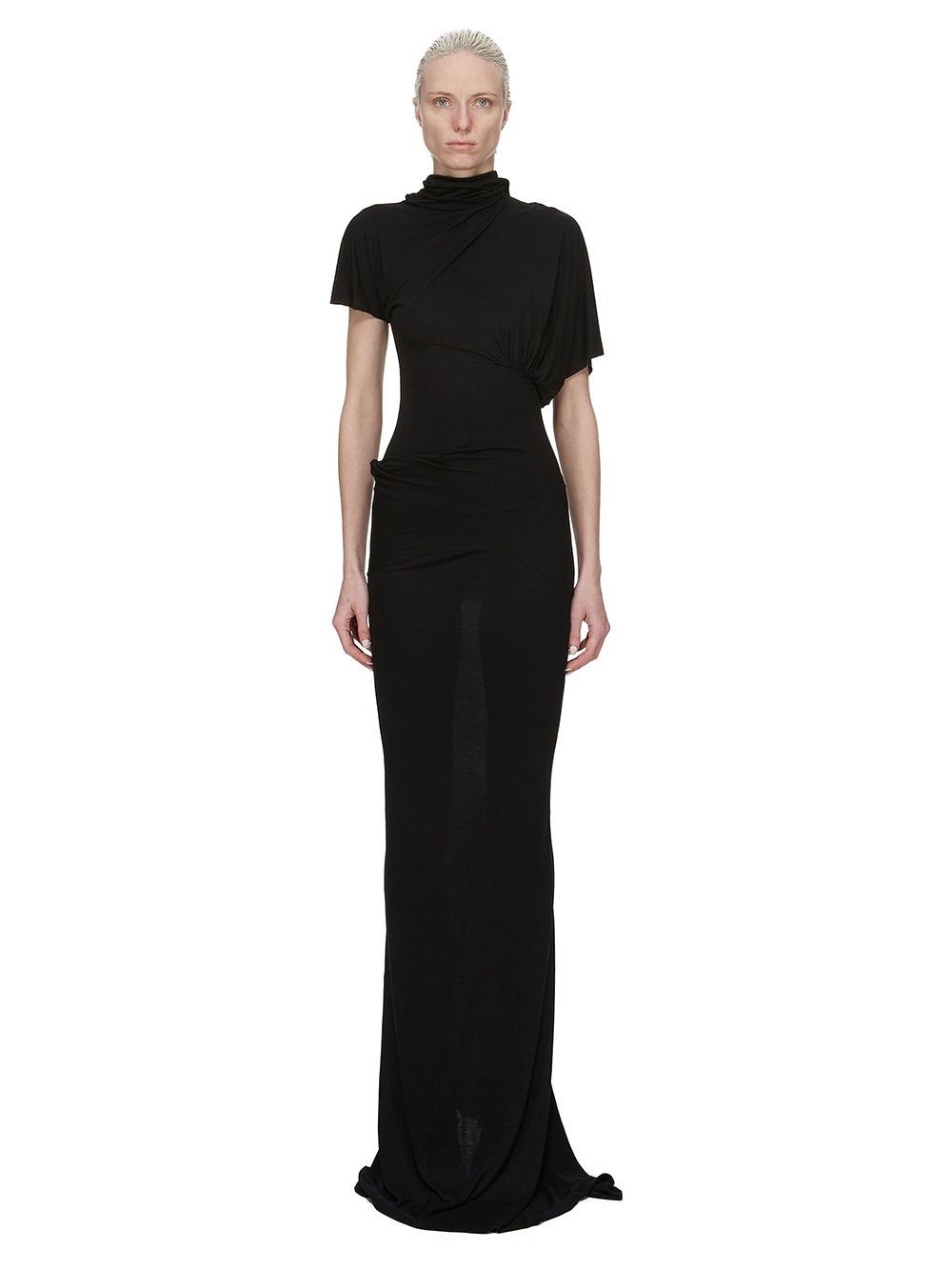 RICK OWENS SS25 HOLLYWOOD LILITH GOWN IN GUN METAL FOIL VISCOSE JERSEY THIS LILITH GOWN SEAM IS FLOOR LENGTH WITH A SLIGHT FISHTAIL AT BACK. IT FEATURES A COWL NECK WITH AN OPENING ON THE BACK. IT HAS A CLOSE TO THE BODY LOWER SECTION AND A LOOSE, DRAPING, FRONT. ITS WIDE, DROPPED SLEEVES ARE ASYMMETRICAL, THE LEFT SLEEVE FALLING AT ELBOW LENGTH AND GATHERING INTO A RUCHED SEAM UNDER LEFT ARM.ITS LONG SKIRT TRAIN HAS A TWIST ON THE RIGHT HIP AND A SEAM ACROSS THE FRONT UPPER THIGH AND REAR THIS LIGHTWEIGHT AND FLUID VISCOSE JERSEY IS STRETCHY AND HAS A SOFT AND GLOSSY SEMI-TRANSPARENT FOIL OVERLAY THIS JERSEY IS MADE FROM FSC® CERTIFIED VISCOSE WHICH ENSURES THAT THE FIBERS ARE PRODUCED FROM RESPONSIBLY MANAGED SOURCES AND NO DEFORESTATION OCCURS COLOR: GUN METAL MATERIAL: 94% VISCOSE + 6% ELASTANE MODEL IS 181CM TALL MODEL WEARS SIZE 40