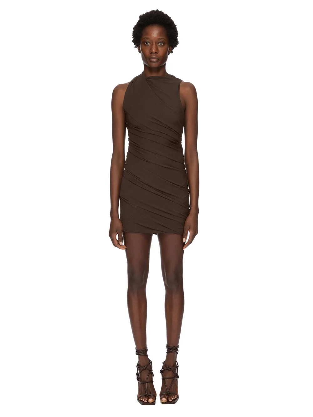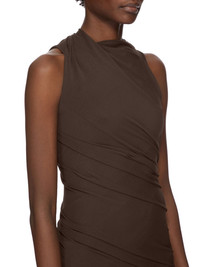RICK OWENS FW25 CONCORDIANS LUNA DRESS IN RAISIN VISCOSE CREPE JERSEY THIS LUNA DRESS IS MID-THIGH LENGTH AND SLEEVELESS. IT FEATURES A HIGH DRAPED NECKLINE AND HAS A BODY HUGGING FIT THAT DRAPES ACROSS THE BODY FROM RIGHT TO LEFT ALONG A BIAS SEAM THIS LIGHTWEIGHT AND FLUID VISCOSE CREPE JERSEY IS STRETCHY AND HAS A MATTE CREPE FACE SIDE AND A SOFT BACKSIDE THIS LIGHTWEIGHT AND FLUID VISCOSE CREPE JERSEY IS STRETCHY AND HAS A MATTE CREPE FACE SIDE AND A SOFT BACKSIDE. THIS JERSEY IS MADE FROM FSC® - CERTIFIED (FSC - C162846) VISCOSE WHICH ENSURES THAT THE FIBERS ARE PRODUCED FROM RESPONSIBLY MANAGED SOURCES AND NO DEFORESTATION OCCURS COLOR: RAISIN MATERIAL: 78% VISCOSE + 17% NYLON + 5% ELASTANE MODEL IS 181CM TALL MODEL WEARS SIZE 40