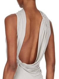 RICK OWENS LILIES FW25 CONCORDIANS EVA MINI IN PEARL CASHMERE BLEND JERSEY THIS EVA MINI IS MID-THIGH LENGTH AND SLEEVELESS. IT HAS A SLIGHTLY DRAPED BOAT NECK, WHICH FALLS INTO AN OPEN BACK, WITH A TWIST IN THE SMALL OF THE RIGHT HIP, AND A BODY SKIMMING FIT THIS MEDIUMWEIGHT AND FLUID MODAL AND CASHMERE BLEND JERSEY HAVE A SOFT AND WARM HANDFEEL COLOR: BLACK MATERIAL: 85% MODAL 9% CASHMERE 6% ELASTANE MODEL IS 181CM TALL MODEL WEARS SIZE 40