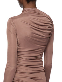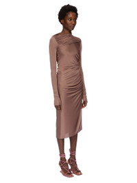 RICK OWENS FW25 CONCORDIANS SVITA LS DRESS IN MAUVE SATIN VISCOSE JERSEY THIS SVITA LS DRESS IS BELOW KNEE LENGTH WITH LONG SLEEVES. IT FEATURES A DRAPED NECKLINE THAT GATHERS ACROSS THE CHEST INTO THE RIGHT ARMHOLE AND HAS A BODY HUGGING FIT THAT GATHERS ACROSS THE BODY AND RUCHES INTO THE LEFT SIDE SEAM. IT THEN OPENS INTO A SPLIT FROM HIGH ON THE THIGH AND TAPERS SLOPES SLIGHTLY TO THE RIGHT HEM. THIS MEDIUMWEIGHT AND FLUID VISCOSE JERSEY HAS A GLOSSY SURFACE AND A COLD AND SOFT HANDFEEL. THIS JERSEY IS MADE FROM CERTIFIED VISCOSE WHICH ENSURES THAT THE FIBERS ARE PRODUCED FROM RESPONSIBLY MANAGED SOURCES AND NO DEFORESTATION OCCURS COLOR: MAUVE MATERIAL: 100% VISCOSE MODEL IS 181CM TALL MODEL WEARS SIZE 40