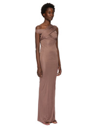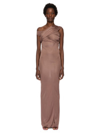 RICK OWENS LILIES FW25 CONCORDIANS SAHARA GOWN IN VISCOSE CREPE JERSEY THIS SAHARA GOWN IS FLOOR LENGTH. IT HAS ONE RIGHT LOW SHOULDER STRAP AND A TWIST OF FABRIC THAT RUNS FROM THE LEFT SHOULDER, ACROSS THE RIGHT CHEST, WHERE IT DRAPES UNDER THE RIGHT ARM. IT HAS AN ARCHED SEAM FROM LEFT SIDE HEM THAT RISES UP OVER THE WAIST, CREATING SLIGHT RUCHING, BEFORE ARCHING DOWN TO THE CENTRE BACK HEM. THIS MEDIUMWEIGHT AND FLUID VISCOSE JERSEY HAS A GLOSSY SURFACE AND A COLD AND SOFT HANDFEEL. THIS JERSEY IS MADE FROM CERTIFIED VISCOSE WHICH ENSURES THAT THE FIBERS ARE PRODUCED FROM RESPONSIBLY MANAGED SOURCES AND NO DEFORESTATION OCCURS COLOR: MAUVE MATERIAL: 100% VISCOSE MODEL IS 181CM TALL MODEL WEARS SIZE 40