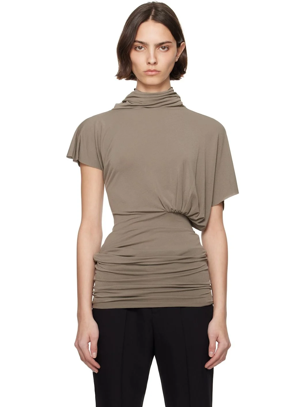 Stretch FSC®-certified viscose-blend jersey T-shirt. · Asymmetrical draped construction · Cowl neck · Gathering at side seam · Cutout at back collar Supplier color: Dust 78% viscose, 17% polyamide, 5% elastane. Made in Italy 251039F110031