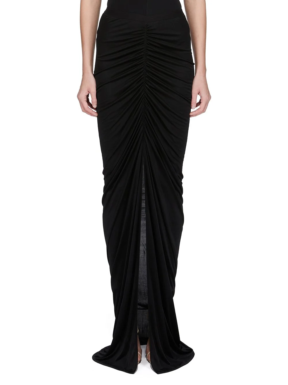 RICK OWENS FW25 CONCORDIANS POPPY SKIRT IN BLACK SATIN VISCOSE JERSEY THIS POPPY SKIRT TRAILS FLOOR LENGTH AND HAS AN ELASTICIZED WAISTBAND. IT GATHERS ALONG THE CENTRE FRONT SEAMLINE CREATING RUCHING AND DRAPINGS, BEFORE DESCENDING AND FLARING, INTO A DRAPED SKIRT FROM THE BOTTOM OF THE GATHERING, WITH A FISHTAIL FRONT THIS MEDIUMWEIGHT AND FLUID VISCOSE JERSEY HAS A GLOSSY SURFACE AND A COLD AND SOFT HANDFEEL THIS JERSEY IS MADE FROM CERTIFIED VISCOSE WHICH ENSURES THAT THE FIBERS ARE PRODUCED FROM RESPONSIBLY MANAGED SOURCES AND NO DEFORESTATION OCCURS COLOR: BLACK MATERIAL: 100% VISCOSE MODEL IS 181CM TALL MODEL WEARS SIZE 40
