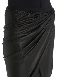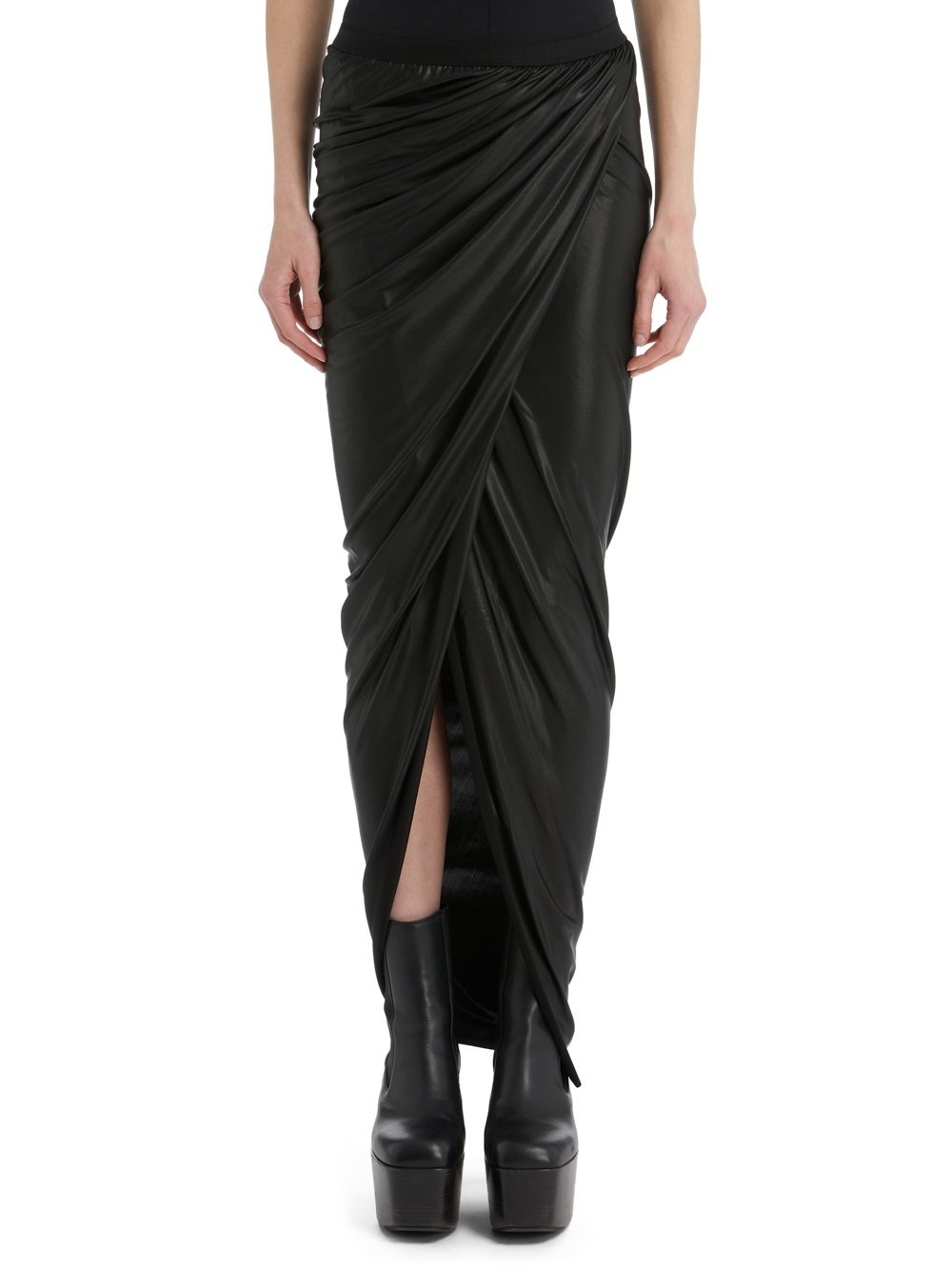 LILIES SS22 FOGACHINE LONG VERED SKIRT IN GLOSSY VISCOSE JERSEY THIS LONG VERED SKIRT IS ANKLE LENGTH, IT HAS AN ELASTIC WAISTBAND AND FEATURES A FRONT WRAPPED PANEL CREATING A HIGH FRONT SPLIT AND GATHERED DRAPINGS A FLUID VISCOSE JERSEY WITH A SOFT GLOSSY SEMI-TRANSPARENT METALLIC FOIL OVERLAY. THIS JERSEY IS MADE FROM FSC®CERTIFIED VISCOSE WHICH ENSURES THAT THE FIBERS ARE PRODUCED FROM RESPONSIBLY MANAGED PLANTATIONS AND NO DEFORESTATION OCCURS - COLOR: BLACK - MATERIAL: 95% VISCOSE + 5% ELASTANE- MODEL IS WEARING SIZE 40- MODEL IS 181 CM TALL