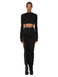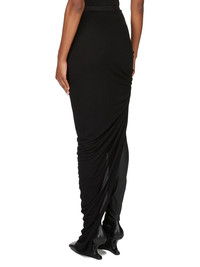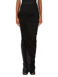 RICK OWENS SS25 HOLLYWOOD TWIST EDFU SKIRT IN BLACK FLUID VISCOSE JERSEY THIS TWIST EDFU SKIRT IS ANKLE LENGTH. IT HAS AN ELASTICIZED WAISTBAND, AND A TWIST ON THE RIGHT HIP, CREATING A HIGH SPLIT AND DRAPED SKIRT THAT TAPERS TO THE FLOOR. IT HAS A SEAM RUNNING DOWN THE CENTRE BACK SPINE THIS MEDIUMWEIGHT AND FLUID VISCOSE JERSEY AND HAS A SOFT AND LIGHTLY BRUSHED HANDFEEL. THIS JERSEY IS MADE FROM FSC® - CERTIFIED (FSC - C162846) VISCOSE WHICH ENSURES THAT THE FIBERS ARE PRODUCED FROM RESPONSIBLY MANAGED SOURCES AND NO DEFORESTATION OCCURS COLOR: BLACK MATERIAL: 100% VISCOSE MODEL IS 181CM TALL MODEL WEARS SIZE 40