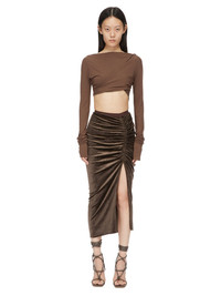 RICK OWENS FW24 PORTERVILLE SVITA KNEE SKIRT IN TAUPE VELVET JERSEY THIS SVITA KNEE SKIRT IS BELOW KNEE LENGTH. IT HAS A BODY HUGGING FIT THAT RUCHES ACROSS THE BODY, INTO THE LEFT SIDE SEAM, THAT OPENS INTO A SPLIT FROM THE THIGH AND TAPERS SLIGHTLY TO THE HEM THIS MEDIUMWEIGHT VELVET JERSEY IS FLUID AND HAS A SOFT VELVETY HANDFEEL. THIS JERSEY IS MADE FROM FSC® CERTIFIED VISCOSE WHICH ENSURES THAT THE FIBERS ARE PRODUCED FROM RESPONSIBLY MANAGED SOURCES AND NO DEFORESTATION OCCURS - COLOR: TAUPE - MATERIAL: 83% VISCOSE + 17% NYLON - MODEL IS 181CM TALL - MODEL WEARS SIZE 40