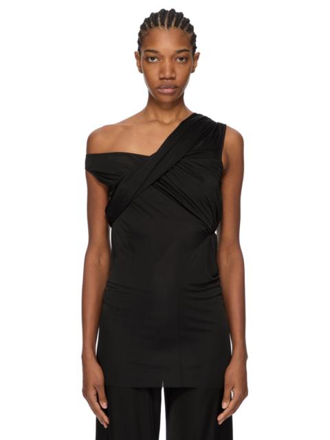 RICK OWENS FW25 CONCORDIANS SAHARA TOP IN BLACK FLUID VISCOSE JERSEY THIS SAHARA TOP IS HIP LENGTH. IT HAS ONE RIGHT LOW SHOULDER STRAP AND A TWIST OF FABRIC THAT RUNS FROM THE LEFT SHOULDER, ACROSS THE RIGHT CHEST, WHERE IT DRAPES UNDER THE RIGHT ARM. IT HAS AN ARCHED SEAM FROM LEFT SIDE HEM THAT RISES UP OVER THE WAIST, CREATING SLIGHT RUCHING, BEFORE ARCHING DOWN TO THE CENTRE BACK HEM THIS MEDIUMWEIGHT AND FLUID VISCOSE JERSEY AND HAS A SOFT AND LIGHTLY BRUSHED HANDFEEL THIS JERSEY IS MADE FROM FSC® - CERTIFIED (FSC - C162846) VISCOSE WHICH ENSURES THAT THE FIBERS ARE PRODUCED FROM RESPONSIBLY MANAGED SOURCES AND NO DEFORESTATION OCCURS COLOR: BLACK MATERIAL: 100% VISCOSE MODEL IS 181CM TALL MODEL WEARS SIZE 40