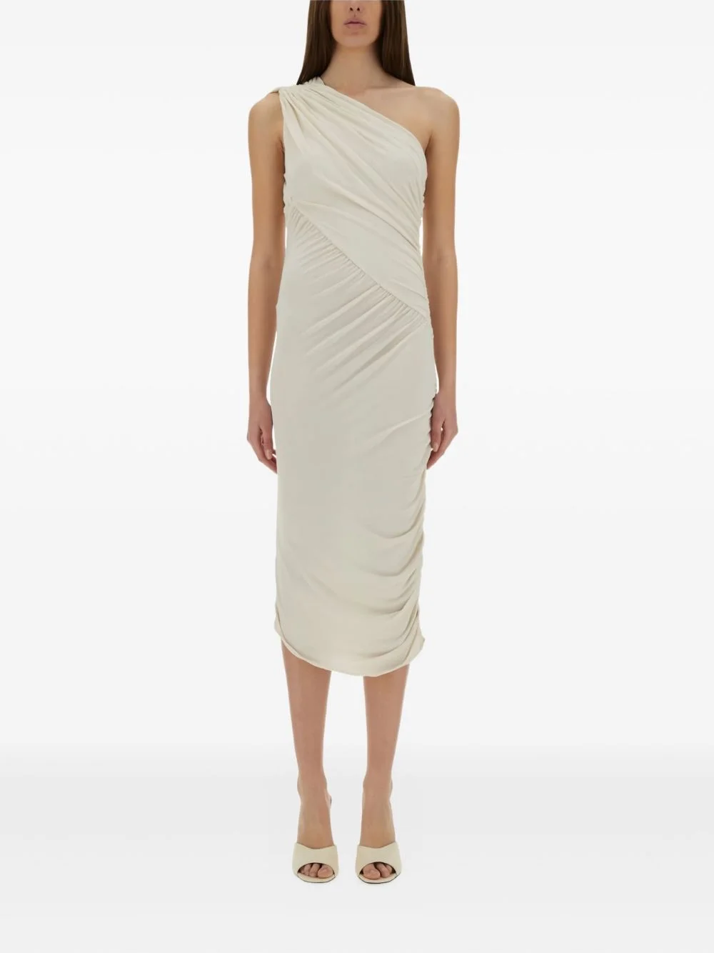 one-shoulder draped midi day dress Highlights - Off-white - One-shoulder design - Draped and cut-out detailing - Ruching - Midi length Made in Italy Composition Fabric 100% Washing instructions Read Manufacturer Guidelines