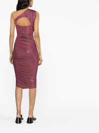 one-shoulder draped midi dress Rick Owens Lilies' penchant for experimental silhouettes is captured in this midi dress. The draped design benefits from ruching and a glossy finish that lends it a dramatic sheen. Highlights - Dark magenta - Glossy finish - Ruched detailing - Cut-out detailing - Fully draped - One-shoulder - Sleeveless - Straight hem - Knee-length Made in Italy Composition Outer: Viscose 95%, Spandex/Elastane 5% Lining: Viscose 100% SIZE & FIT Model measurements Height 5 ft 10 in(1.78 m) Bust/Chest 31.49 in(80 cm) Hips 35.03 in(89 cm) Waist 23.62 in(60 cm) FittingInformation Designed for a close fit throughout Made from a midweight non-stretch fabric, this piece offers minimal elasticity when worn This piece fits true to size – take your usual size