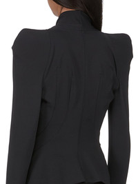 RICK OWENS LILIES FW25 CONCORDIANS PRINCESS JKT IN BLACK COMPACT STRETCH JERSEY THIS PRINCESS JKT IS HIP LENGTH WITH LONG SLIM SLEEVES. IT FEATURES AN OFF-CENTER FRONT ZIPPER, SHAWL-LIKE NECK AND STRUCTURED SHOULDERS. IT HAS REAR SEA DETAILS AND A CENTRE BACK SEAM DOWN THE SPINE. THIS HEAVYWEIGHT STRETCH JERSEY IS COMPACT WITH A DRY HANDFEEL. THIS JERSEY IS MADE FROM FSC® - CERTIFIED (FSC - C162846) VISCOSE WHICH ENSURES THAT THE FIBERS ARE PRODUCED FROM RESPONSIBLY MANAGED SOURCES AND NO DEFORESTATION OCCURS. COLOR: BLACK MATERIAL: 85% VISCOSE + 9% NYLON + 6% ELASTANE MODEL IS 181CM TALL MODEL WEARS SIZE 40