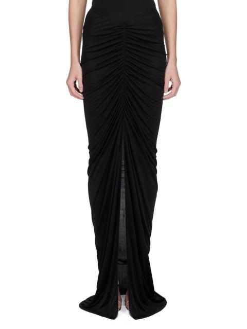 RICK OWENS FW25 CONCORDIANS POPPY SKIRT IN MAUVE SATIN VISCOSE JERSEY THIS POPPY SKIRT TRAILS FLOOR LENGTH AND HAS AN ELASTICIZED WAISTBAND. IT GATHERS ALONG THE CENTRE FRONT SEAMLINE CREATING RUCHING AND DRAPINGS, BEFORE DESCENDING AND FLARING, INTO A DRAPED SKIRT FROM THE BOTTOM OF THE GATHERING, WITH A FISHTAIL FRONT THIS MEDIUMWEIGHT AND FLUID VISCOSE JERSEY HAS A GLOSSY SURFACE AND A COLD AND SOFT HANDFEEL THIS JERSEY IS MADE FROM CERTIFIED VISCOSE WHICH ENSURES THAT THE FIBERS ARE PRODUCED FROM RESPONSIBLY MANAGED SOURCES AND NO DEFORESTATION OCCURS COLOR: MAUVE MATERIAL: 100% VISCOSE MODEL IS 181CM TALL MODEL WEARS SIZE 40