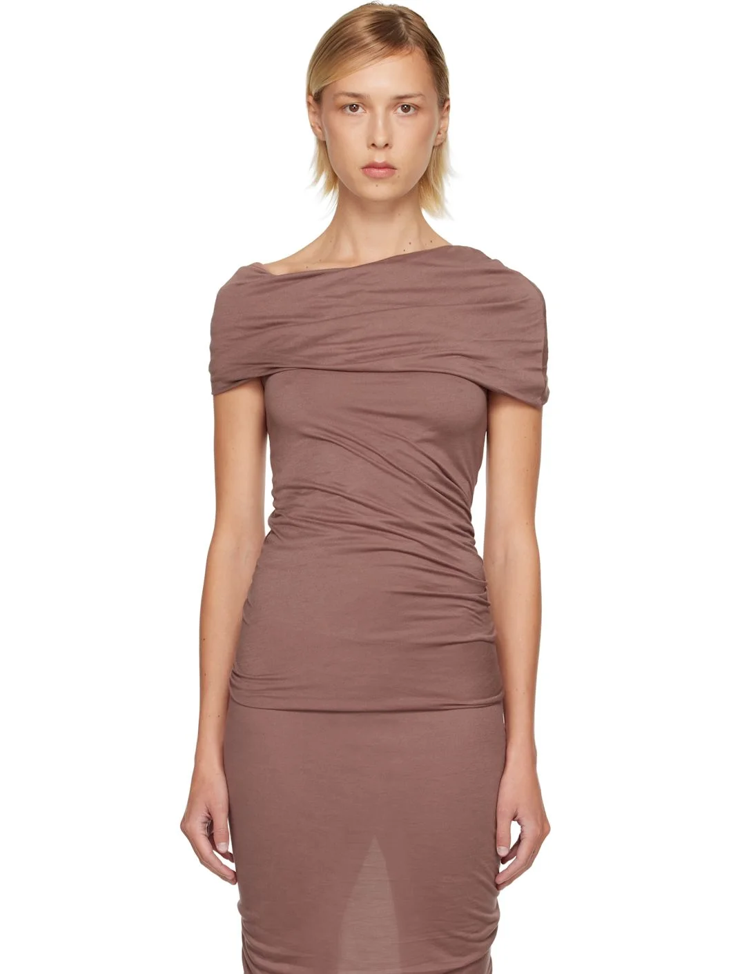 Viscose jersey T-shirt. · Gathering at boatneck · Twisted side seam Supplier color: Mauve 100% viscose. Made in Italy 252039F110011