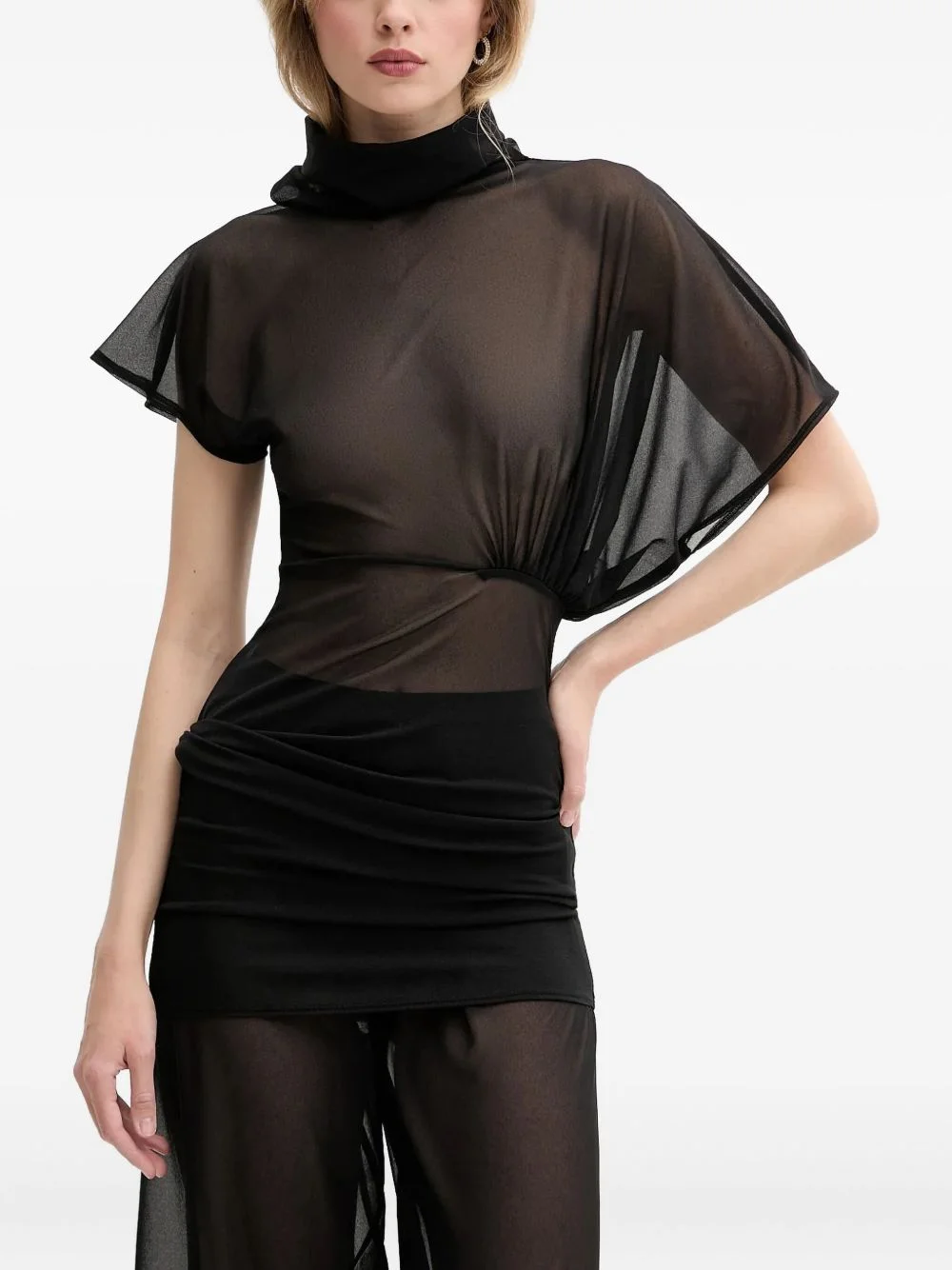 sheer high-neck top Highlights - Black - Sheer mesh - High neck - Short sleeves - Draped detailing - Gathered waist - Open back Imported Composition Fabric 100% Washing instructions Read Manufacturer Guidelines