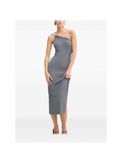 single-shoulder strap midi dress Highlights - Grey - Single shoulder strap - Metallic shoulder detail - Asymmetrical neckline - Midi length - Side split Imported Composition Viscose 78%, Polyamide 17%, Elastane 5% Washing instructions Read Manufacturer Guidelines