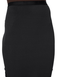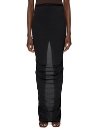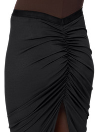 RICK OWENS LILIES FW25 CONCORDIANS EVA SKIRT IN BLACK VISCOSE CREPE JERSEY THIS EVA SKIRT IS FLOOR LENGTH AT FRONT WITH AN ELASTICIZED WAISTBAND. IT FEATURES A CENTER BACK SLIT TO ABOVE KNEE HEIGHT AND RUCHING ON ALONG THE BACK, OFF-CENTER, SEAM. IT HAS A BODY SKIMMING FIT THIS LIGHTWEIGHT AND FLUID VISCOSE CREPE JERSEY IS STRETCHY AND HAS A MATTE CREPE FACE SIDE AND A SOFT BACKSIDE THIS JERSEY IS MADE FROM C162846 CERTIFIED VISCOSE WHICH ENSURES THAT THE FIBERS ARE PRODUCED FROM RESPONSIBLY MANAGED SOURCES AND NO DEFORESTATION OCCURS COLOR: BLACK MATERIAL: 78% VISCOSE 17% POLYAMIDE 5% ELASTANE MODEL IS 181CM TALL MODEL WEARS SIZE 40