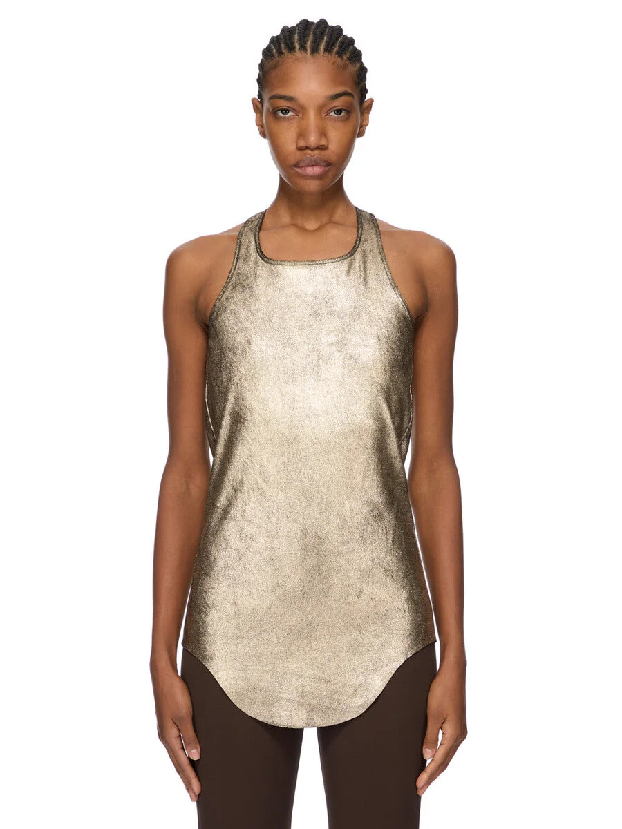 RICK OWENS FW25 CONCORDIANS BASIC TANK IN GOLD METALLIC STRETCH LAMB LEATHER THIS BASIC TANK IS HIP LENGTH WITH A ROUNDED RAW CUT HEM THAT DIPS IN FRONT AND BACK. IT HAS A ROUND NECKLINE AND THIN SHOULDER STRAPS THAT FLOW INTO A SLIGHT RACER BACK. IT FEATURES THE SIGNATURE SINGLE SEAM RUNNING DOWN THE CENTRE BACK SPINE. THIS STRETCH LAMB LEATHER HAS A SOFT HANDFEEL AND A GOLD FINISH. THIS LEATHER IS MADE BY A SECOND GENERATION FAMILY OWNED TANNERY IN THE SOUTH OF FRANCE SPECIALIZING ONLY IN STRETCH LEATHER PRODUCTION. EACH SKIN IS STRETCHED OUT TO ITS LIMIT AND BONDED TO A COTTON AND LYCRA FABRIC BACKING. WHEN DYED, THE HEAT OF THE PROCESS ACTIVATES THE LYCRA ELASTIC FIBRES THAT SHRINK THE FABRIC AND WITH IT THE SKIN, BACK TO ITS ORIGINAL SIZE. THE LEATHER THEN EXITS THE PROCESS AS STRETCH. COLOR: GOLD MATERIAL: 65% LAMB LEATHER + 34% COTTON + 1% SPANDEX MODEL IS 181CM TALL MODEL WEARS SIZE 40