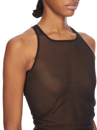 RICK OWENS SS25 HOLLYWOOD BASIC TANK IN BLACK TECH ORGANZA JERSEY THIS BASIC TANK IS HIP LENGTH WITH A ROUNDED RAW CUT HEM THAT DIPS IN FRONT AND BACK. IT HAS A ROUND NECKLINE AND THIN SHOULDER STRAPS THAT FLOW INTO A SLIGHT RACER BACK. IT FEATURES THE SIGNATURE SINGLE SEAM RUNNING DOWN THE CENTRE BACK SPINE THIS LIGHTWEIGHT AND SEMI-TRANSPARENT TECHNICAL ORGANZA JERSEY IS STRETCHY WITH A DRY TECHNICAL HADFEEL. THIS FABRIC IS MADE USING GRS CERTIFIED RECYCLED POLYESTER WHICH ENSURES A REDUCTION IN WATER CONSUMPTION, EMISSIONS AND HAZARDOUS WASTE, LESSENING THE DEPENDENCE ON NON-RENEWABLE RESOURCES COLOR: BLACK MATERIAL: 100% POLYESTER MODEL IS 181CM TALL MODEL WEARS SIZE 38