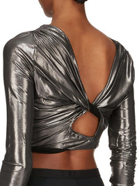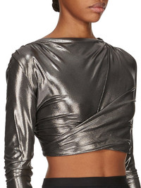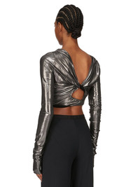 RICK OWENS SS25 HOLLYWOOD JADE LS CROP IN GUNMETAL FOIL VISCOSE JERSEY THIS JADE LS CROP TOP IS CROPPED ABOVE THE WAIST, AND HAS LONG SLEEVES. IT HAS A SLIGHT COWL NECK, WIDE, GATHERED SHOULDERS AND CROSS-DRAPING ON FRONT. THE BACK IS CUT INTO A LOW V, WITH TWIST DRAPING AND A KEYHOLE OPENING THIS LIGHTWEIGHT AND FLUID VISCOSE JERSEY IS STRETCHY AND HAS A SOFT AND GLOSSY SEMI-TRANSPARENT FOIL OVERLAY. THIS JERSEY IS MADE FROM FSC® CERTIFIED VISCOSE WHICH ENSURES THAT THE FIBERS ARE PRODUCED FROM RESPONSIBLY MANAGED SOURCES AND NO DEFORESTATION OCCURS COLOR: GUNMETAL MATERIAL: 94% VISCOSE + 6% ELASTANE MODEL IS 181CM TALL MODEL WEARS SIZE 40