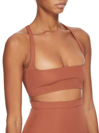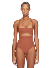 RICK OWENS SS25 HOLLYWOOD UNHORNY TOP IN RUST COMPACT STRETCH JERSEY THIS UNHORNY TOP IS A SLIM TANK TOP THAT COVERS MOST OF THE BREASTS. IT HAS A WIDE, SQUARE, NECKLINE AND THIN SHOULDER STRAPS THAT FLOW INTO A RACER BACK. IT FEATURES THE SIGNATURE SINGLE SEAM RUNNING DOWN THE CENTRE BACK SPINE THIS HEAVYWEIGHT STRETCH JERSEY IS COMPACT WITH A DRY HANDFEEL. THIS JERSEY IS MADE FROM FSC® CERTIFIED VISCOSE WHICH ENSURES THAT THE FIBERS ARE PRODUCED FROM RESPONSIBLY MANAGED SOURCES AND NO DEFORESTATION OCCURS COLOR: RUST MATERIAL: 85% VISCOSE + 9% POLYAMIDE + 6% ELASTANE MODEL IS 181CM TALL MODEL WEARS SIZE 40
