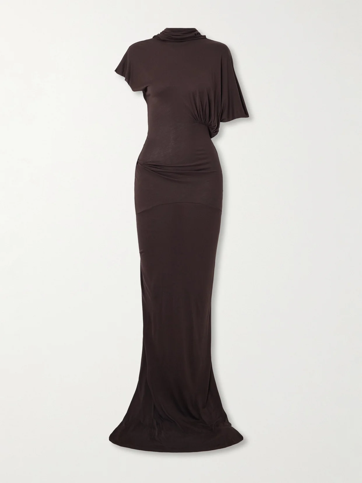 Rick Owens' 'Lilith' gown captures subdued drama. It's made from soft jersey that's draped through the asymmetric bodice and twisted at the hip. It fits comfortably close before flaring out to a floor-pooling hem. Elevate the statuesque silhouette with sculptural jewelry.