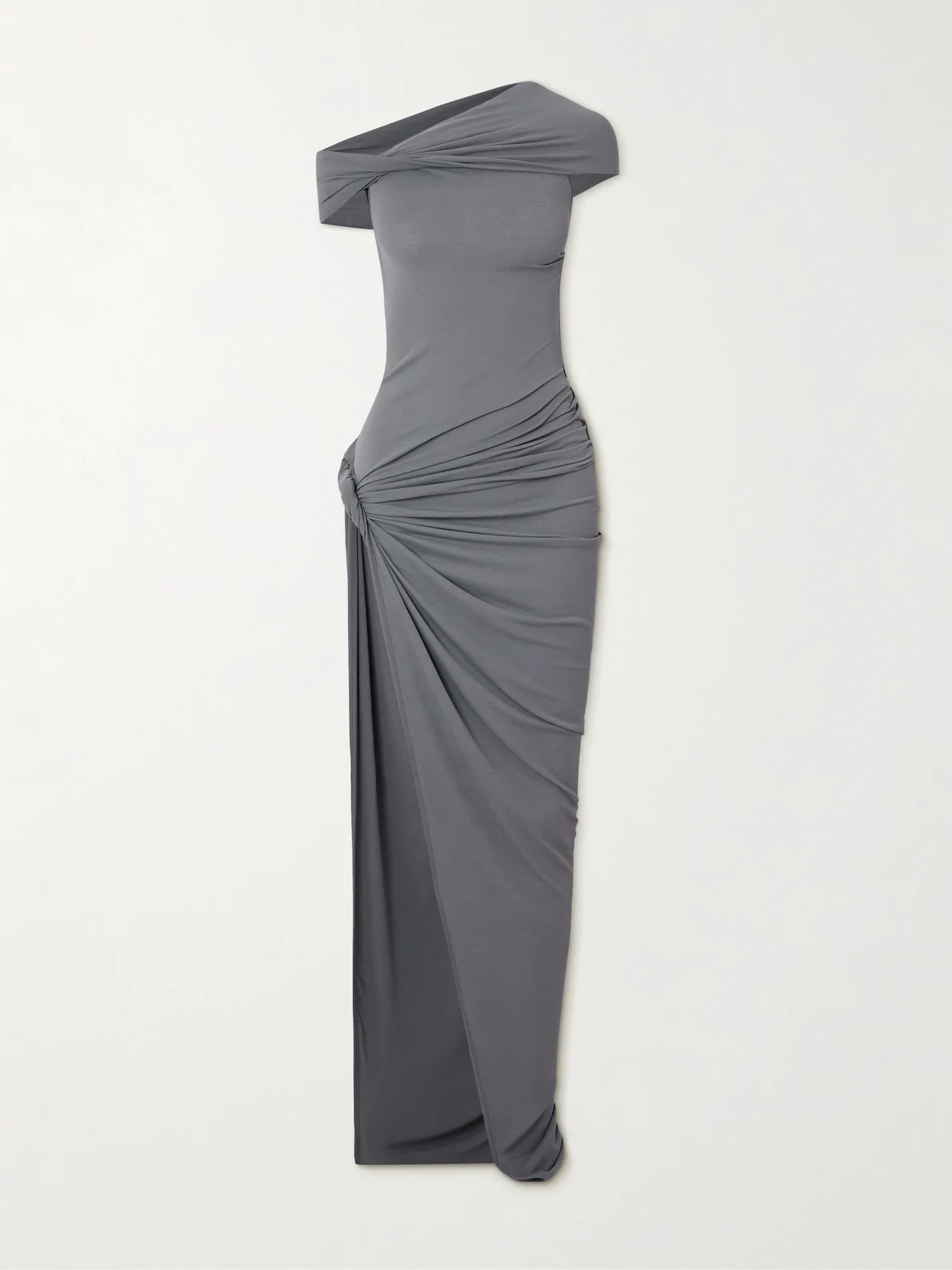 Rick Owens' 'Lola' dress is artfully twisted at the shoulder-baring neckline and thigh-grazing split, creating a sculptural, gathered look. It's made from crepe de chine for a figure-hugging fit and falls to a floor-pooling hem.