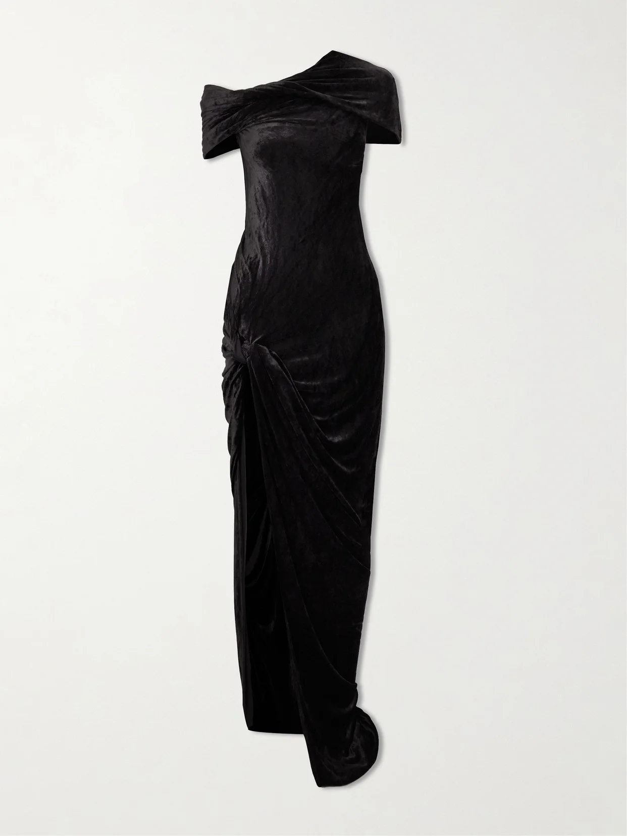 Rick Owens' 'Lola' dress is artfully twisted at the shoulder-baring neckline and thigh-grazing split, creating a sculptural effect. It's made from tactile crushed-velvet for a figure-hugging fit and falls to a floor-pooling hem.