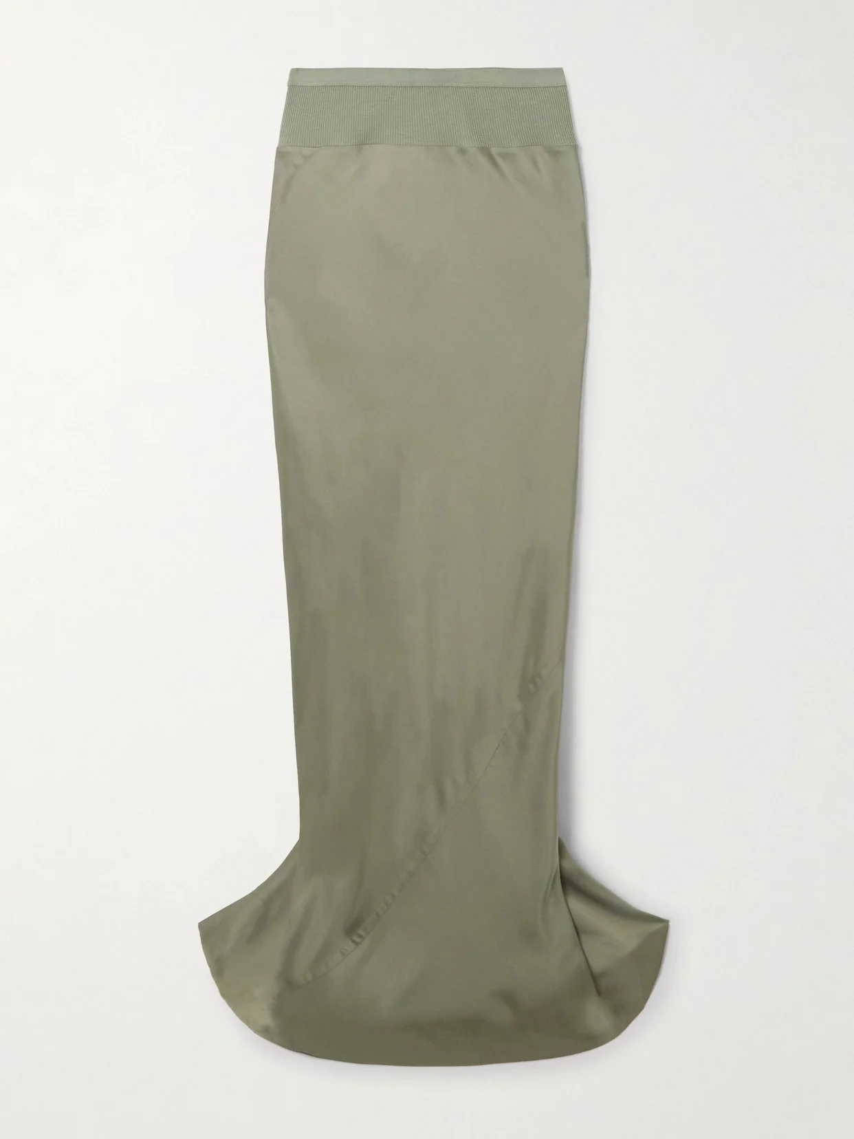 Rick Owens' 'Long Coda' skirt is made from bias-cut charmeuse and designed with a godet panel at the back to enhance the fluid drape. Traced with asymmetric stitching, it has a ribbed cotton-blend trim along the elasticated waistband for a comfortable fit and unexpected textural contrast.
