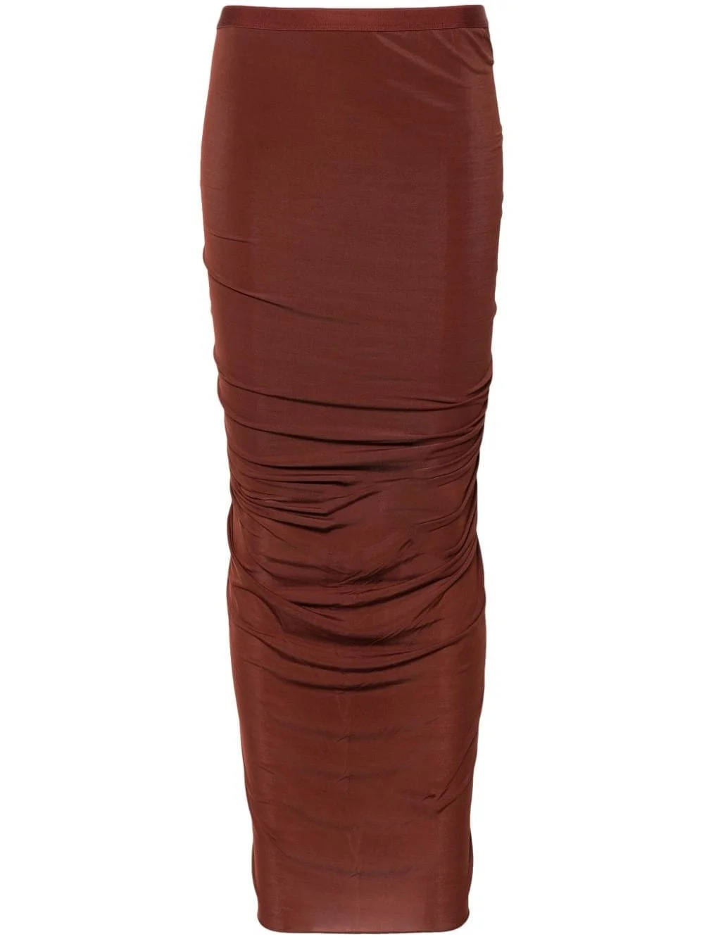 Shrimp ruched-detail skirt Highlights - Light brown - Stretch-jersey - Seam detailing - Ruched detailing - High waist - Elasticated waistband - Rear slit - Straight hem - Mid-length - Unlined Made in Italy Composition Cupro 96%, Elastane 4% Washing instructions Hand Wash