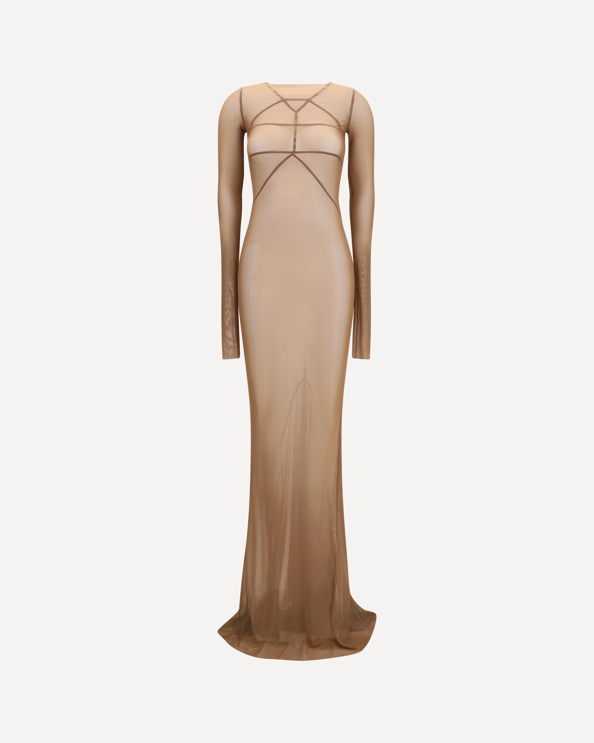 The long transparent tulle Dress by Rick Owens stands out for an essential and dramatic silhouette that interprets elegance in a contemporary way. The dress model by Rick Owens is crafted from stretch tulle and features long sleeves and geometric seams on the front that define the structure of the garment. The teardrop insert at the back widens into a slight train, adding movement and a dramatic effect. The long Rick Owens dress completes the design with a distinctive and statement style. DETAILS - Sku: RO01F6589TUS_44 - Season: SS26 - Fit: Regular - Composition: GENERAL 93% Polyamide 7% Elastane - MADE IN ITALY