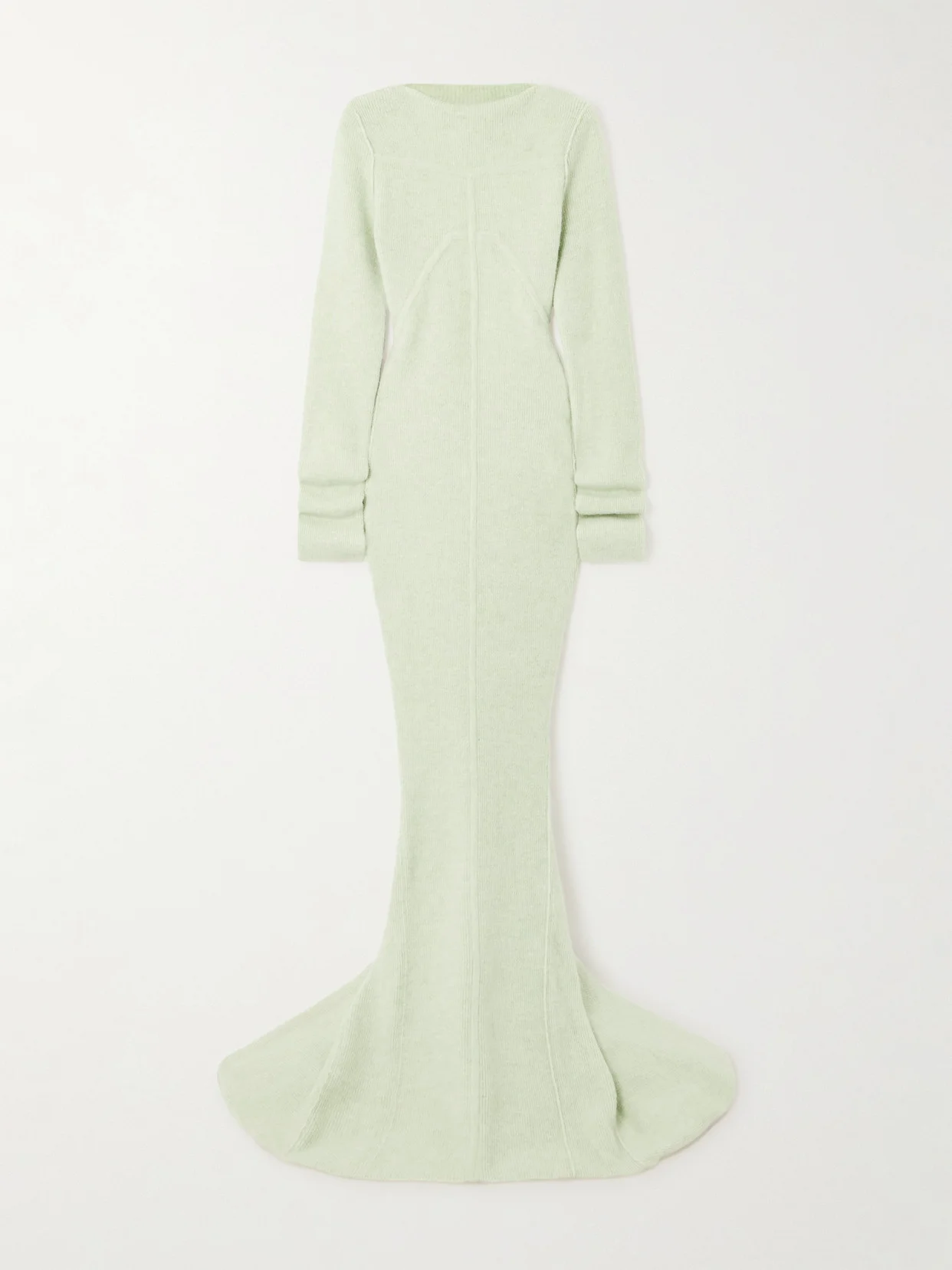 Rick Owens' ‘Luna' gown is a cozy yet elegant option for events during the cooler months. It's knitted with a generous amount of alpaca and wool and has a fuzzy texture, alluring open back and floor-sweeping hem.