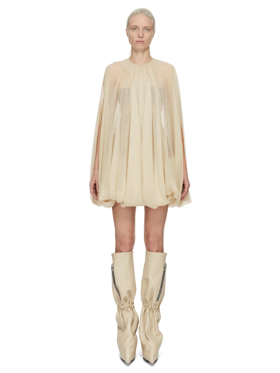 RICK OWENS SS26 TEMPLE LUXOR CAPE IN SAND SILK CHIFFON THIS LUXOR CAPE IS BELOW HIP LENGTH. IT IS A HAS A ROUND NECK, WITH FASTEN, AND DRAPES DOWN IN BEAUTIFUL FOLDS TO BELOW HGH ON THE THIGH. THIS LIGHTWEIGHT AND SEMI-TRANSPARENT SILK CHIFFON IS FLUID WITH A MATTE SURFACE AND DRY HANDFEEL. IT IS WOVEN IN THE COMO REGION OF ITALY KNOWN FOR ITS HERITAGE OF SILK PRODUCTION. THIS FABRIC IS MADE USING GOTS CERTIFIED ORGANIC SILK BECAUSE IT MEANS THE NATURAL FIBER IS MADE WITHOUT HARMFUL CHEMICALS, WHICH LEAVES OUR SOIL, AIR AND WATER CLEANER FROM CONTAMINATES. COLOR: SAND MATERIAL:100% SILK MODEL IS 181CM TALL MODEL WEARS SIZE 40
