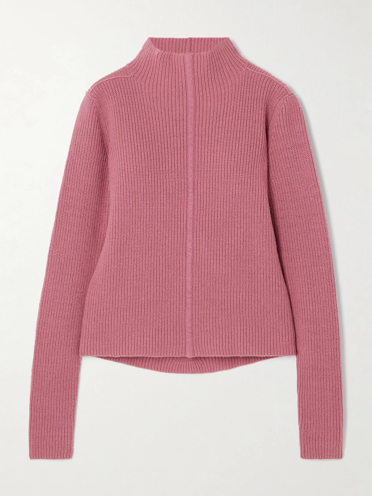 Rick Owens' 'Maglia' sweater has been rib-knitted in Italy from a cashmere and wool-blend that's artfully spliced through the back to create a fluid drape. Gold-tone hoop earrings will complement the high turtleneck, as well as the beautiful antique-rose shade.